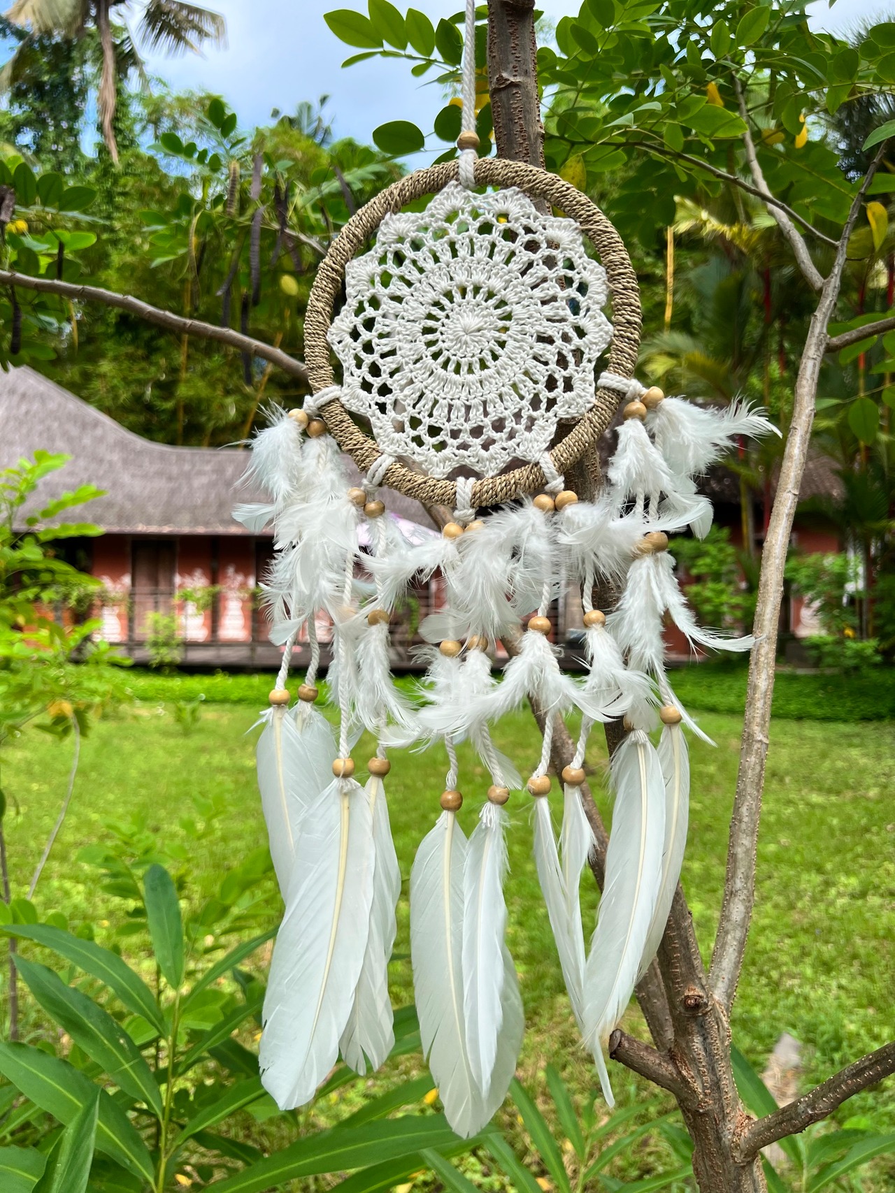 ラウンド部分:麻ひも、ウッドビーズ、リアルフェザーが使用されています。