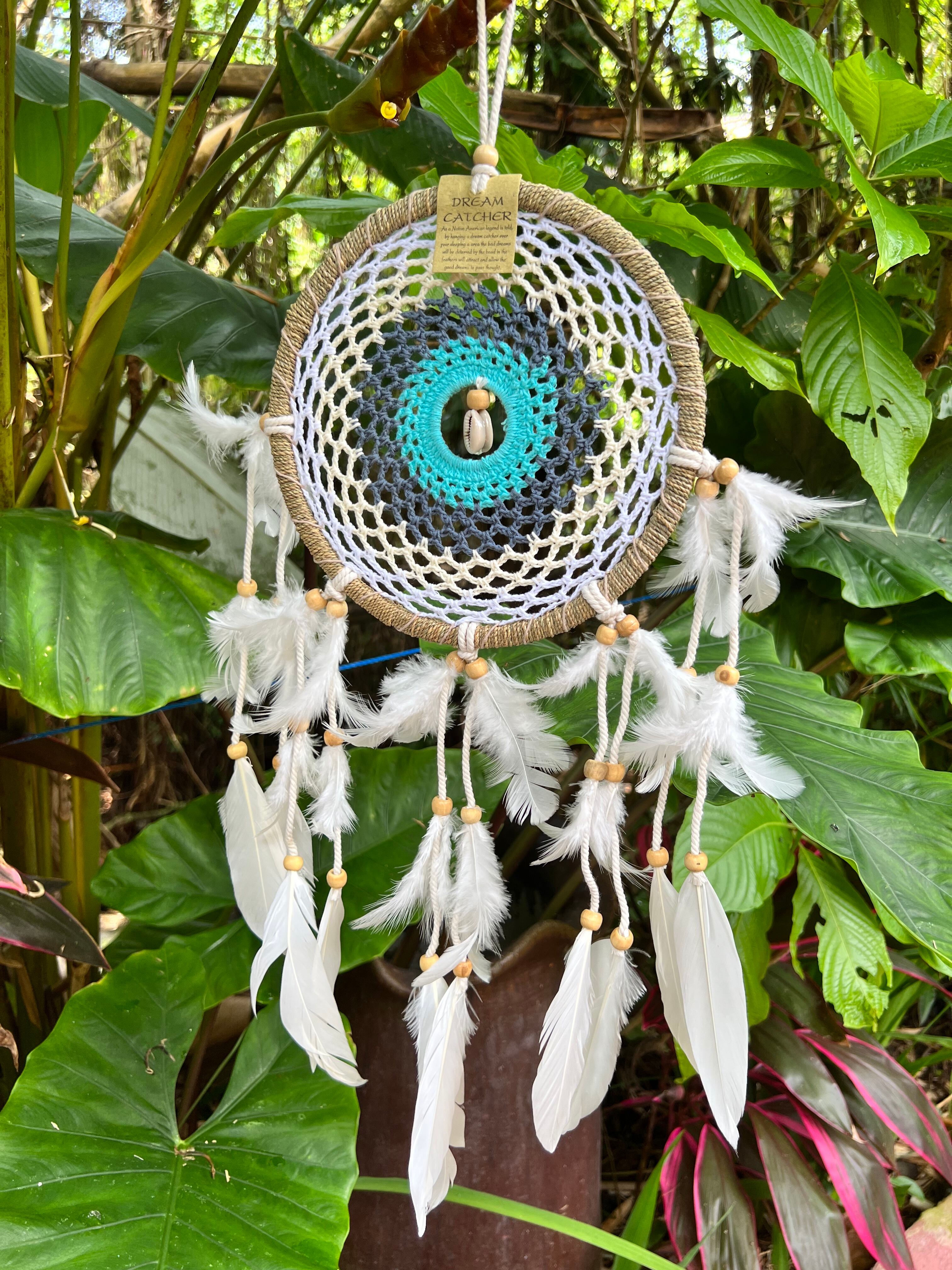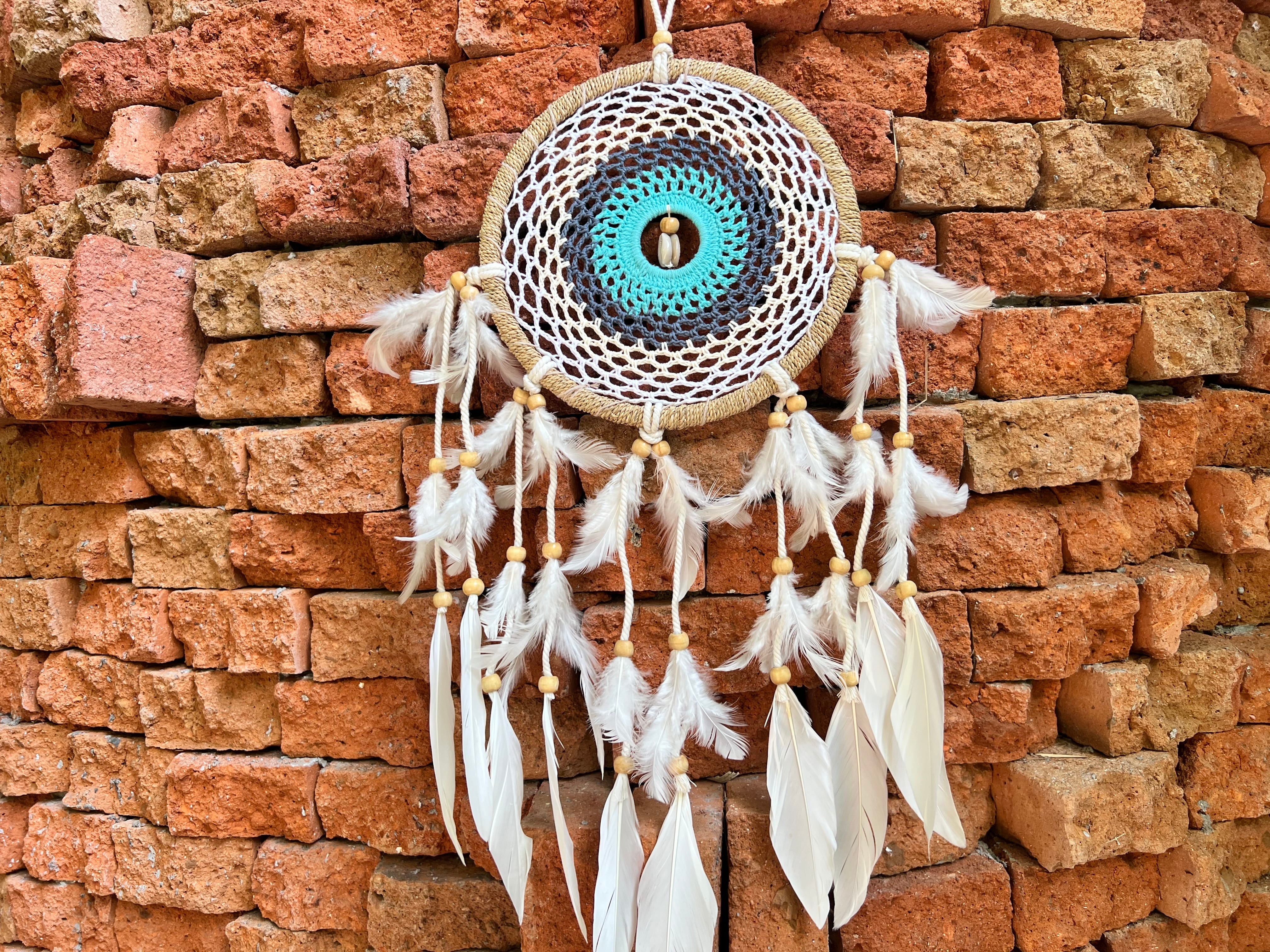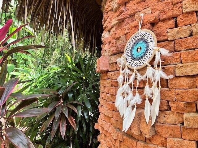 ラウンド部分:麻ひも、リアルシェル、ウッドビーズ、リアルフェザーが使用されています。