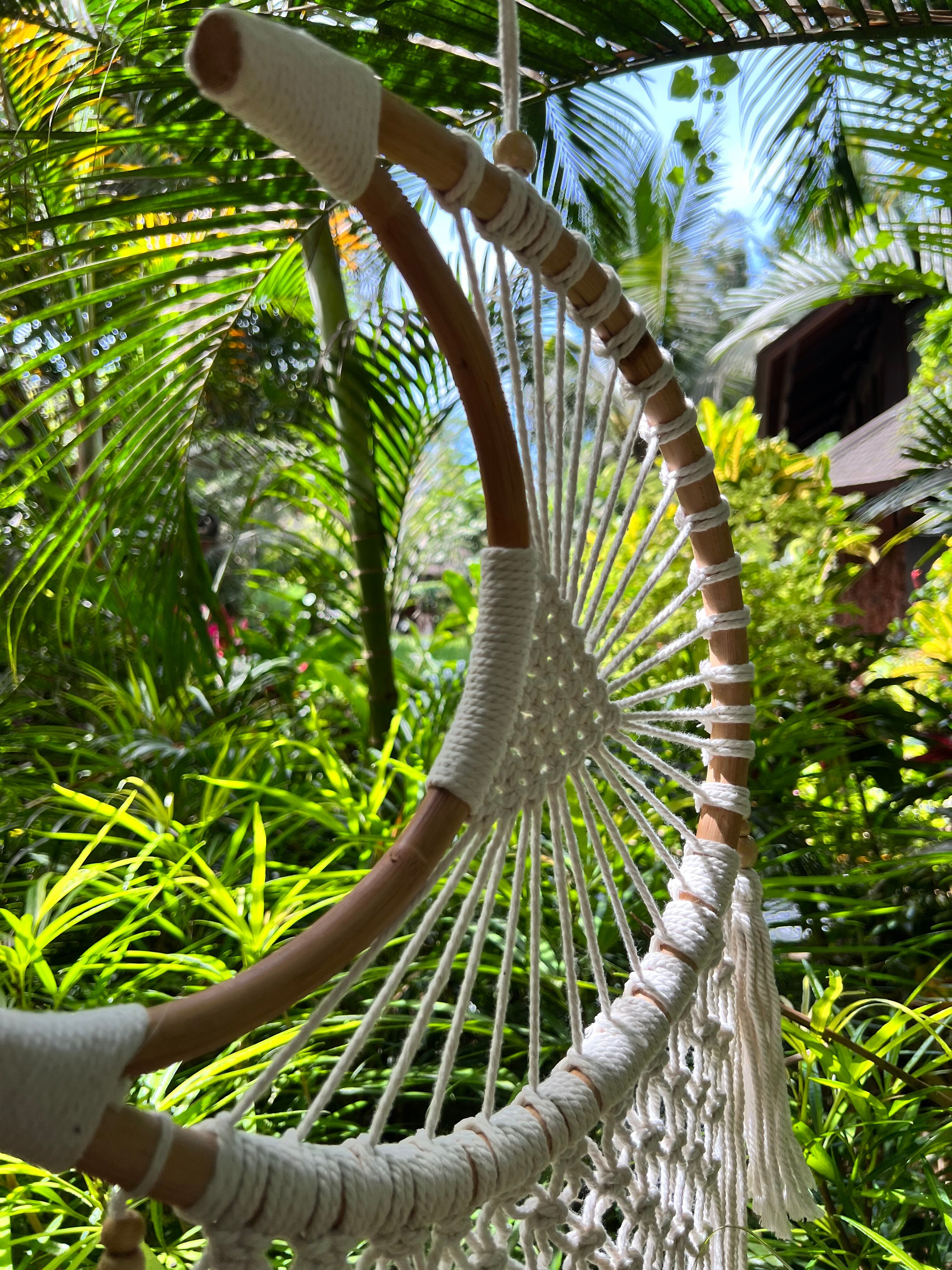 ムーン部分:木製、マクラメ紐、ウッドビーズ、リアルフェザーが使用されています。