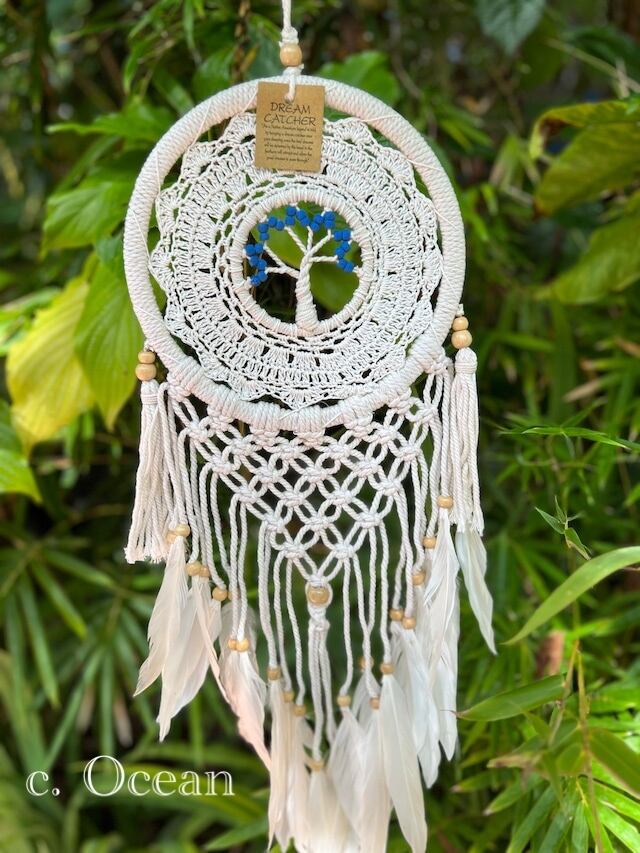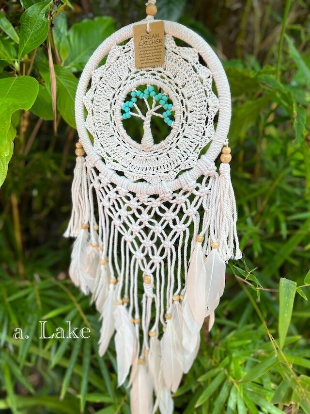 ラウンド部分:マクラメ紐、ウッドビーズ、リアルフェザーが使用されています。