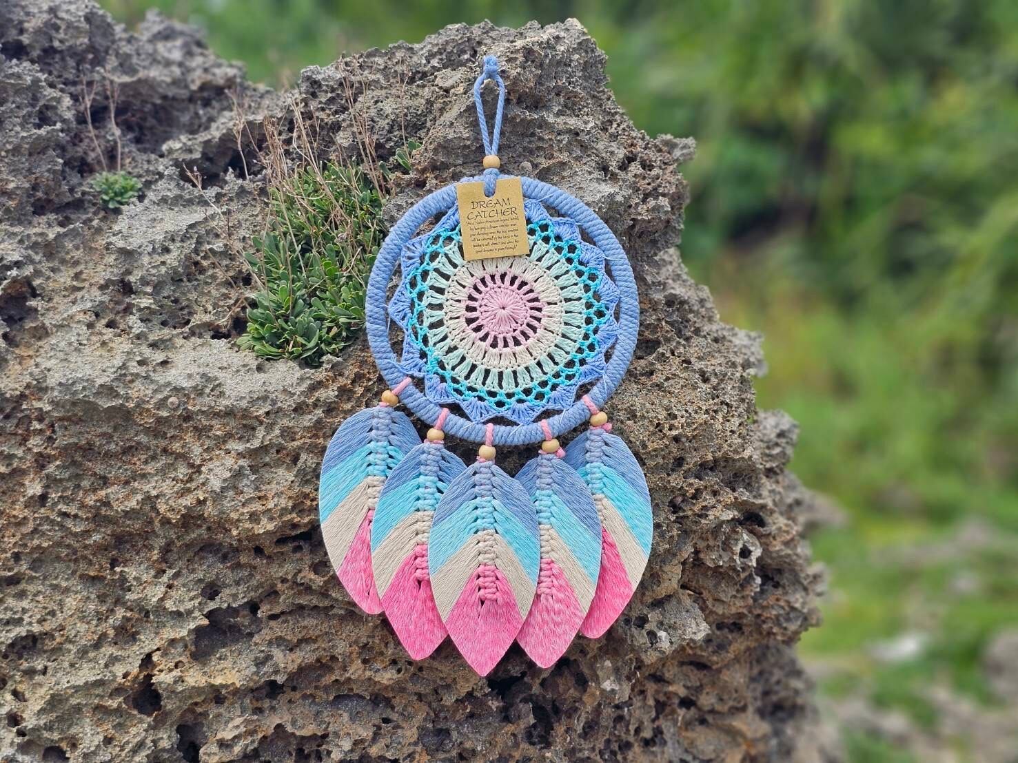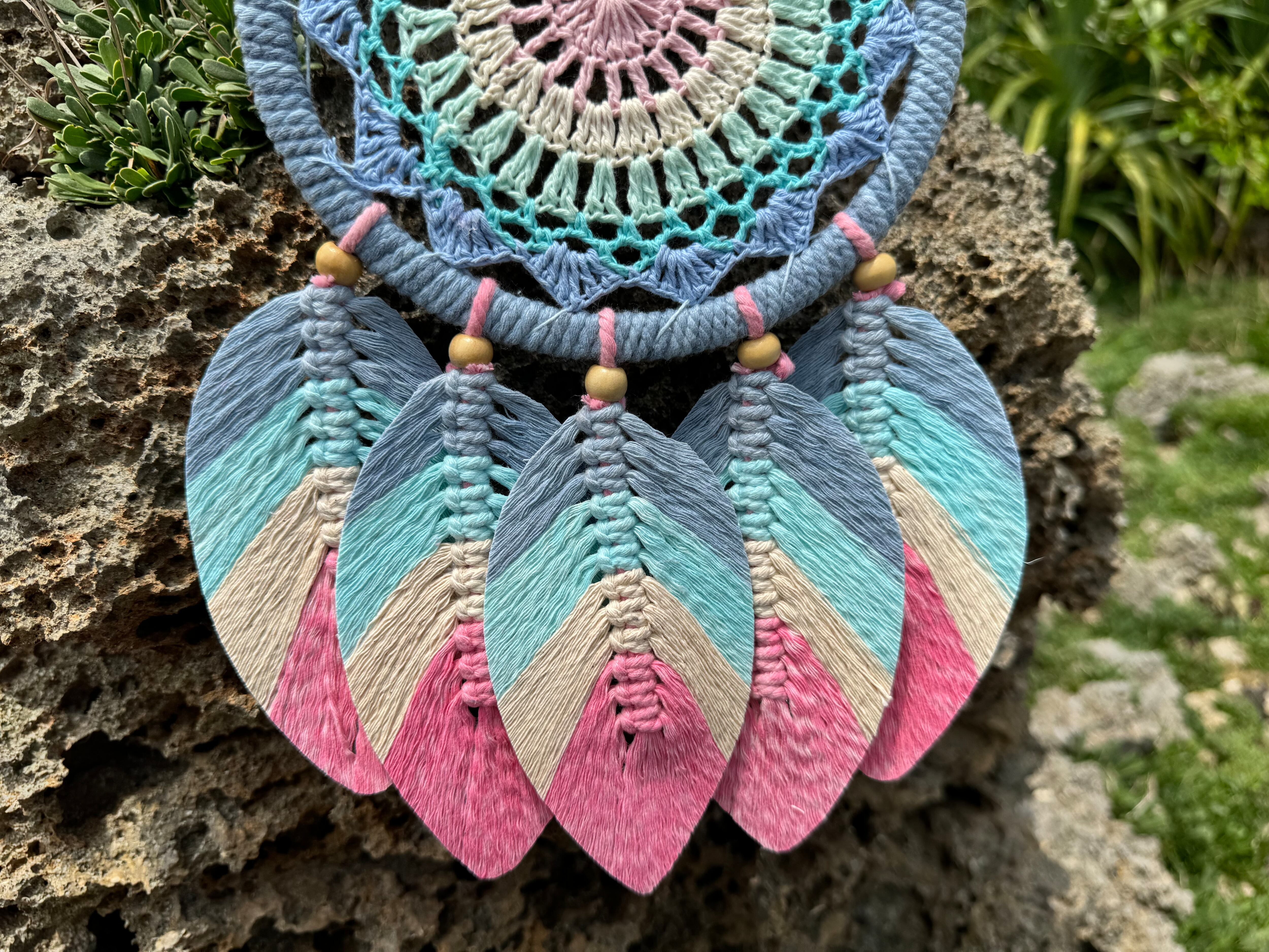 ラウンド部分:貝殻、マクラメ紐、ウッドビーズ、リアルフェザーが使用されています。